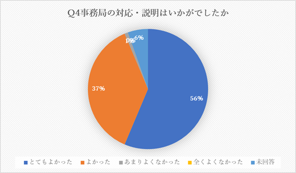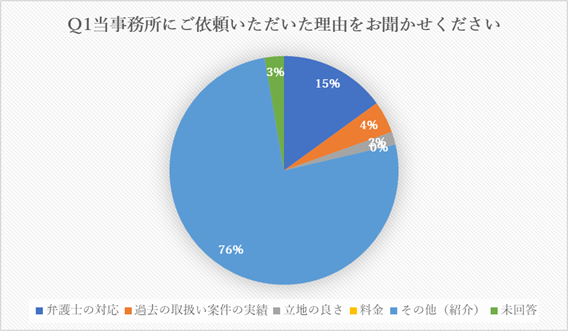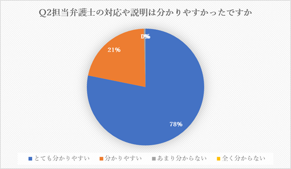 当事務所では,無事解決したお客様に対し,以下のとおり,6つの質問事項を記載したアンケートをお送りしております。これまでご返送いただいたアンケート(回答件数220件。平成29年7月1日~令和7年12月31日)の結果について,「お客様の声」として,ご紹介いたします。